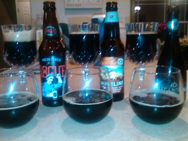 The nose on these three brews were all very distinct.  I’m going to switch the order here, and go by the order in which they were drank.  First the Meantime was very strong on the coffee, with a malty complexity that had a little bit of a sour scent on the back side.  In some ways it smelled more coffee like than beer like.  The Pipeline was the most nondescript of the three.  I find I have trouble smelling malt, so if a beer has a malty nose it smells a little flat to me.  As this beer warmed up the kona coffee scent came out, and perhaps a little flowery scent that was very nice.  The Rogue lived up to its name and lead with Hops!  Its like they said “fu@k it” we are going big!  There was coffee, and a lot of malty complexity to balance it all out.  Very bold on the nose.