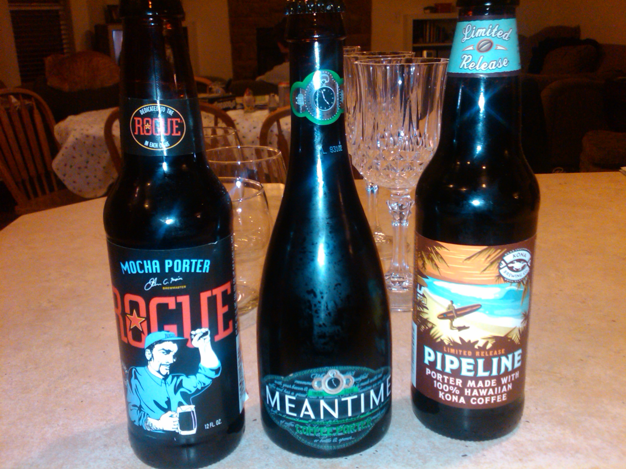 I had the idea to do this throwdown, because coffee porters are getting a lot of attention lately on the various posts, and I had the Rogue that I had picked up previously, so I got the Pipeline and was going to do a two coffee Porter throwdown.  I happened to mention this to Rick my beer guy over at Brewforia in Boise and he threw in the Meantime with my purchase.  I love it when a business man gets it.  He didn’t have to do it, but he did, and I appreciate it more than he can imagine.  He has made a loyal customer out of me.  So much so that he is moving his store to a more central location in the valley which is less convenient for me, but no matter, I will continue to go out of my way to patronize his establishment.  Thanks Rick!
