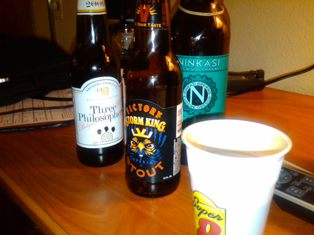 Hopefully your business wasn’t the next morning! I would have been out after the Three Philosophers and the Tricerahops. Looks like you classed up the joint with those fine brews. You should have rang room service and asked for a paper tulip glass! 🙂 I have a bottle of Three Philosophers waiting for me in the fridge. I’ve heard nothing but good things about it, and I’m looking forward to it.