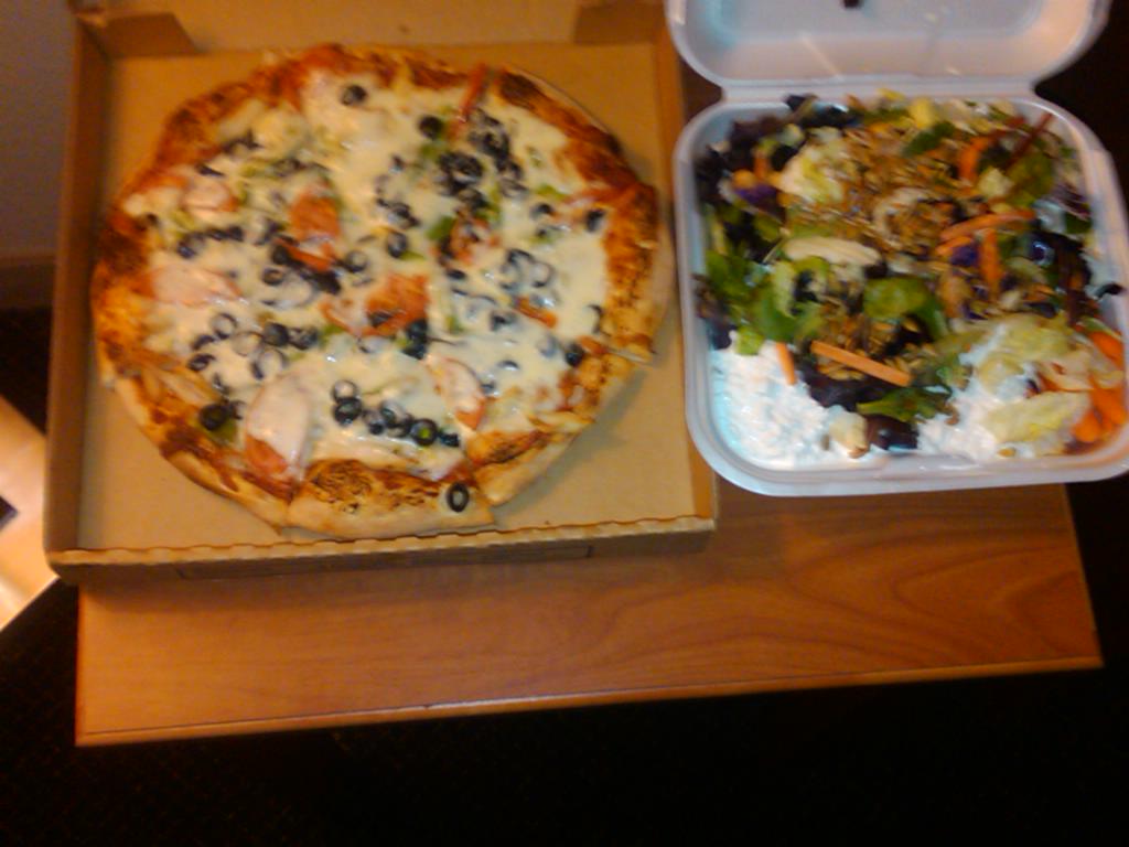 That is right Pizza and a salad.  This time I did mix it up a little I made my own salad at the salad bar, and I got a Greek pizza.  Although it isn’t as greek as it might be because the Pizza Factory ran out of Feta Cheese.  They told me about it , and I said it was ok because I like the toppings anyway, but it was a little unfortunate that they interpreted their lack of feta to mean that they should double up the mozerella cheese.  Oh well, so is life in a very small town.  I’m sure the feta truck will be coming tomorrow.