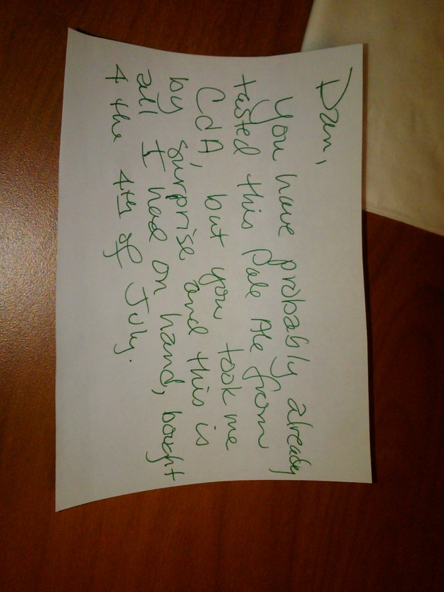 So when I got here and saw this note I was again blown away!  My buddy Lark from the Super 8 had placed a Centennial Pale Ale in the fridge, and it was plenty cold and ready for quaffing.  Man did I need that, and I set out on the balcony and drank the brew and had a good, although interesting cigar (but that is for another blog) and felt that I truly have a friend in Grangeville.  So how was the beer?….