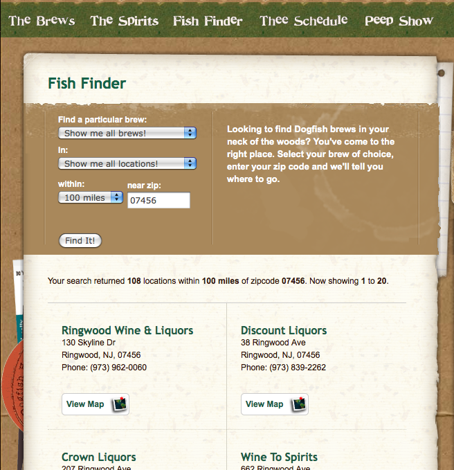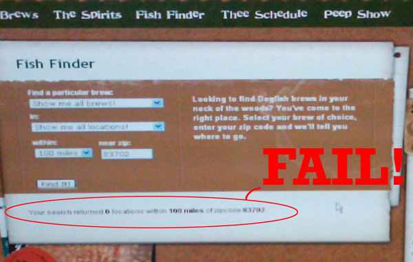 By having a Fish Finder that sorts only by Zipcode! That is how. If you were to look at by state, that’d be different, but Zipcode implies something more than they are even remotely able to deliver on at this point. What would be better is a page that lists the states, the cities, then the retail outlets by a series of clicks. That way they could black out the states and cities that have no shot. This finder thing by zipcode is stupid. I don’t even know the zipcodes in other states. I travel, I might want to pick up their brews while I’m traveling, but because of this stupid fish finder thing I don’t know. So if you are going to do something like this you better be in almost every 100 mile radius, or do something different!