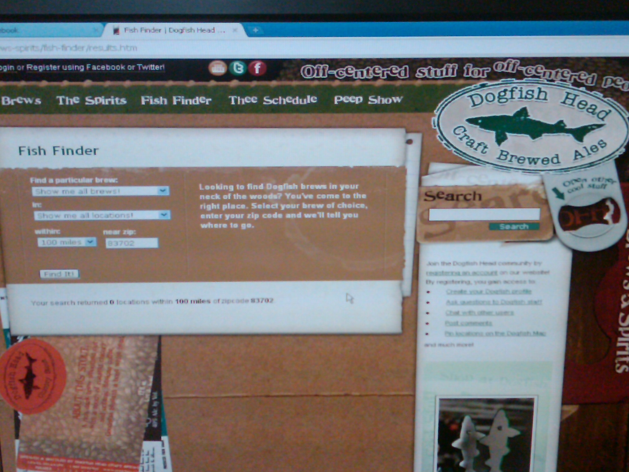 FAIL!! No Dogfish Head Brews within 100 miles of Boise, Idaho! If you are going to have a feature like this on your website, you would think you would be in all urban areas. Otherwise SHUT UP about your off centered crap!