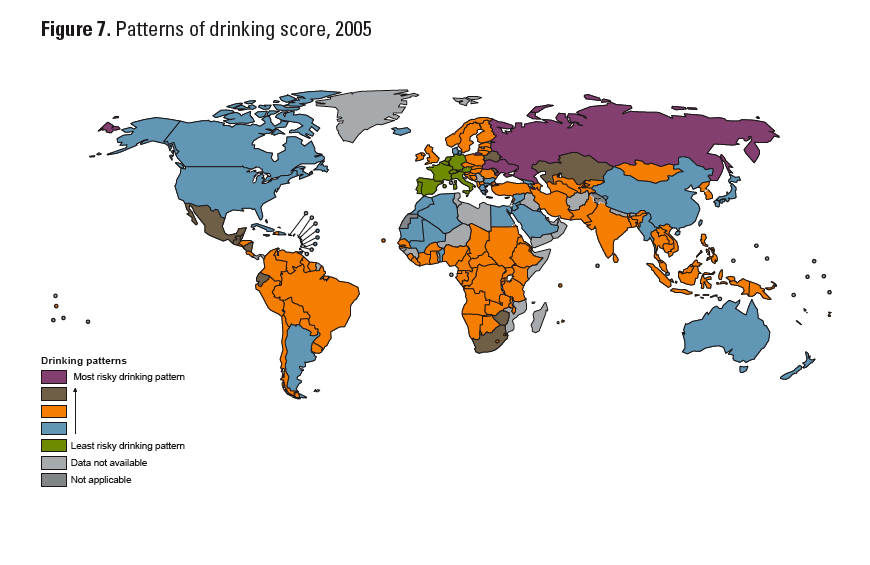 For all of those neo-prohibitionists out there who think our country is going to hell, I say relax.  According to the map below, us Americans mostly know how to hold our liquor, as we enjoy one of the least risky patterns of behavior when it comes to alcohol consumption across the globe.  I mean we’re no France or Italy, but that goes to show that wine just isn’t worth drinking in excess! Kidding, it shows that societies which allow their members to try alcohol at an early age produce a more enlightened drinker than restrictive ones.