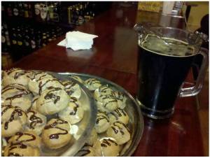 Now we get into the big brews!  This course consisted of a Carbomb eclair that was baked with a cocoa infused cream puff batter and  filled with a whipped cream that was made with Jameson Whiskey and Irish Cream.  Then a chipotle infused chocolate sauce was drizzled on the top of each one.  This was paired with Fred’s Dogfather Imperial Stout.  A 10 % ABV brew that packs a whollup.  The high ABV mixed with the irish cream and Jameson’s in a wonderful way.  The creaminess of the center and the mouthfeel of the big stout blended together very well too, and the biscuitiness of the eclair mixed nicely with the maltiness of the body of the brew.  Finally there was a little orange zest in the eclair that really brought out the hops that were more prevalent on the back side of the stout.  All in all perhaps the most complex pairing of the evening with some of the most amazing flavors.