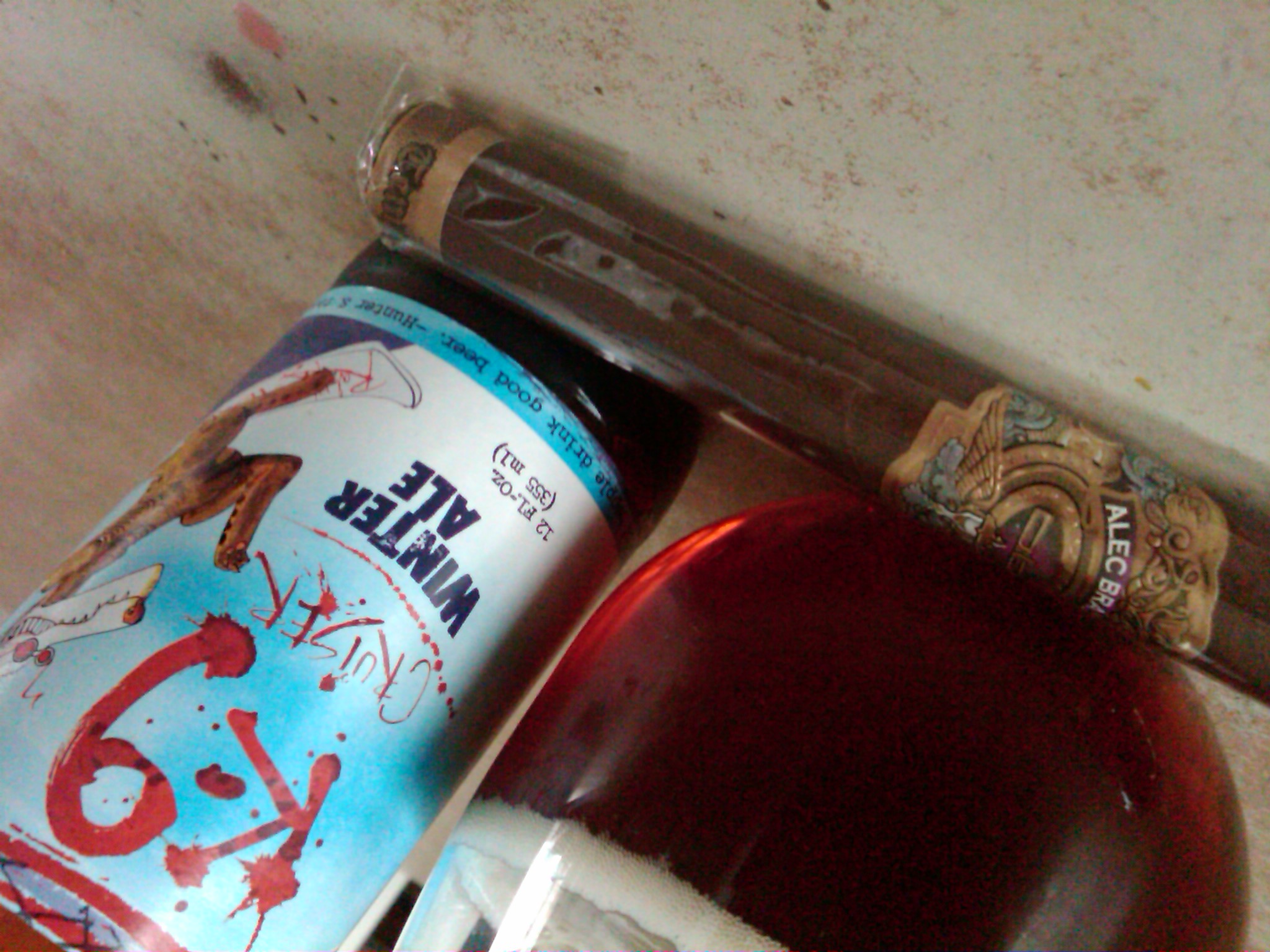 I had an ’09 Flying Dog K-9 Criuser Winter Ale.  As you can see from the picture I also enjoyed it with an Alec Bradley Tempest Cigar.  One reason I aged this beer was because I was afraid of it.  First of all Scott reviewed it over at the Brew Club and didn’t really like it too much.  He said it confused him and that he couldn’t really wrap his mind around what it said on the bottle and the web site vs what he was tasting in the glass.  So Based on this review, and several others I read online I just kept passing it over.