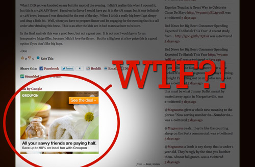 I just read our site without being logged into WordPress and saw a Groupon ad. WTF?!  Can anyone tell me how longs these ads have been here?  Are they bothersome?  We had no idea they were there!