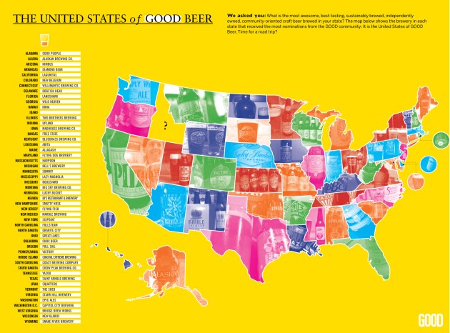 The folks over at GOOD.is (I have no idea what a “dot is” site is, but it looks like the real deal) have put together an infographic showing the United States of GOOD Beer.  They asked their readers to vote for “the most awesome, best-tasting, sustainably brewed, independently owned, community-oriented craft beer brewed in your state,” with the breweries receiving the most votes being featured on the map.