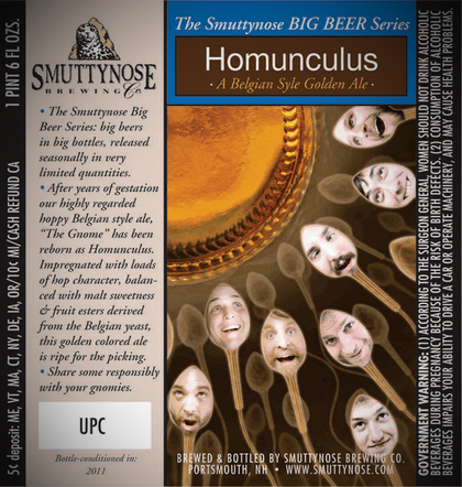 I just came across the label for Smuttynose Homunculus, a Belgian-style golden ale that’s part of their Big Beer Series.  While this looks like another tasty brew from Smutty, the label gives me major cause for pause.