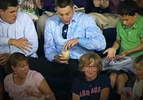 The lady with the Red Sox jersey sitting in front of the guy cracks me up. Everyone else has a pissed look on their face from being sprayed with beer. Not her. I don’t think this was her first rodeo, she has definately had beer poured on her before. I bet she was remembering her college days at that exact moment.