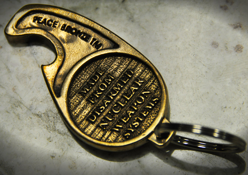 That’s right, for about 20 bucks you can get a bottle opener made of “Peace Bronze,” an alloy created from copper cables that once sent launch signals to the most powerful weapons ever built.  It’s the brainchild of a company called From War to Peace, who also makes hippie-happy jewelry from the stuff.