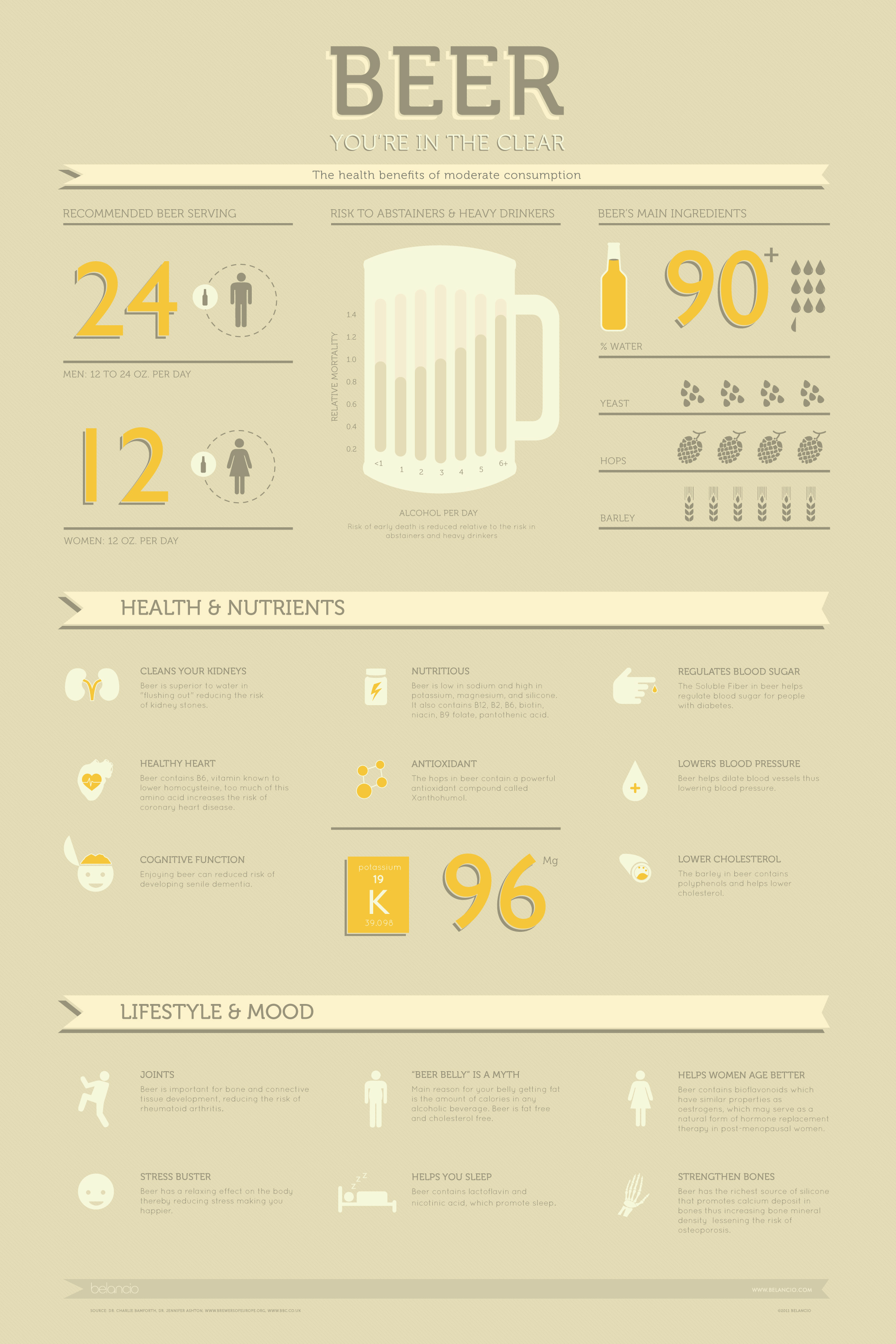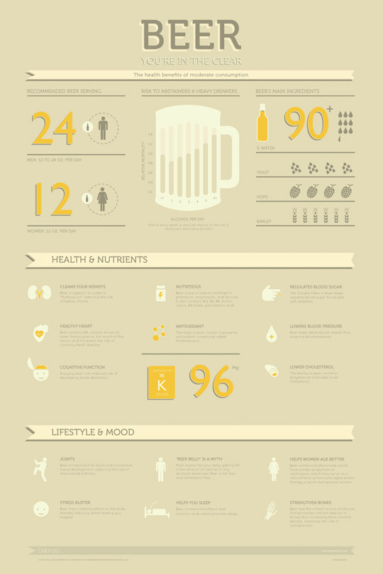 I just happened across this infographic from the design firm Belancio.  We’ve covered most of the health benefits of beer here on the site, but this brings them all together in one place and arranges them in an easy-to-digest manner.  It’s perfect for printing out and hanging on the fridge.  This way you can point to it when your significant other gives you crap about having a beer.  🙂