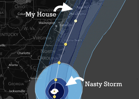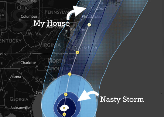 Yes, Irene is heading my way. Living in the WDC metro area, the outside band of the storm rolls right over my area of Northern VA. My weekend plans just got dashed….which is ok because it included a chain saw, zero turn mower and weed eater. So the answer is hunker and spend some quality time in the bunker.