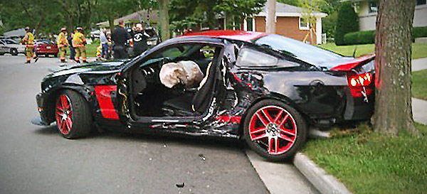 What you see above is Perry Palm’s (the pony pounder) shiny new Mustang Boss 302 Laguna Seca Edition (the bossest of the Boss’s), which he wrapped around at tree this past Sunday.  Perry was hanging out at barbeque in Menominee Falls, Wisconsin enjoying many beers when he decided to show his buddy what his track-tuned ‘Stang could do.  Unfortunately for his pal, that involved airbag deployment and a broken bone sticking out of his right arm.