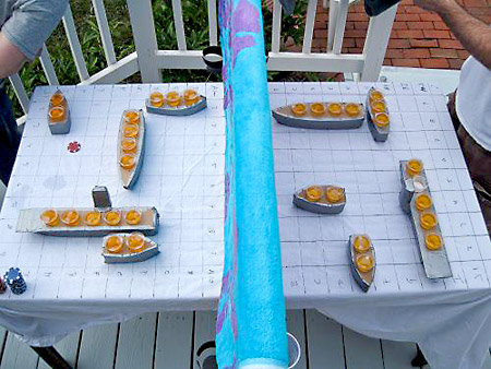 In college we would play a beer pong variation of this, but it didn’t look quite as good. We would have a grid of 100 cups (10×10). The “water” would be beer (which was appropriate, as we drank Natty Light back then… not proud, but it was cheap), and the cups of the ships would be filled with a shot of whiskey. From the other side of the table you couldn’t tell which cups had beer and which cups had whiskey. When a “water” cup was hit, you would drink the beer and remove the cup. When a “ship” cup was hit, you woud take the shot of whiskey and flip the cup over so they knew where the hit was. Standard Battleship rules, except instead of guessing what grid, you were shooting ping pong balls.