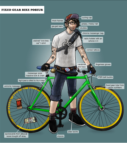 Not that I’m picky, but a fixed gear bike that a hipster would ride is not even close to a single speed mtn bike. Fixies are road bikes with totally different geometry and have a fixed gear (no freewheel, or backpedaling). Single speeds are one gear mtn bikes specifically for the woods. The gearing is so low that it’s painful to ride on pavement. Just my $0.02.