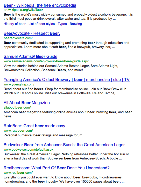 Google is constantly making modifications to their algorithm to make their search results as accurate as possible and to keep people from gaming the system.  I think these results are telling, because they are a pretty accurate reflection of what people want when they think “beer.” Or at least they are a reflection of what people who are using a search engine to find out more about beer are thinking when they type “beer.”  I’m sure this isn’t what a NASCAR fan watching a race at Hooters is thinking when he thinks “beer.”