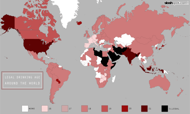 Taking a quick glance, you can see that the old U.S. of A. is one of the darkest shapes out there with a drinking age of 21, which seems a little geriatric when you look at all the lighter shades on the map.