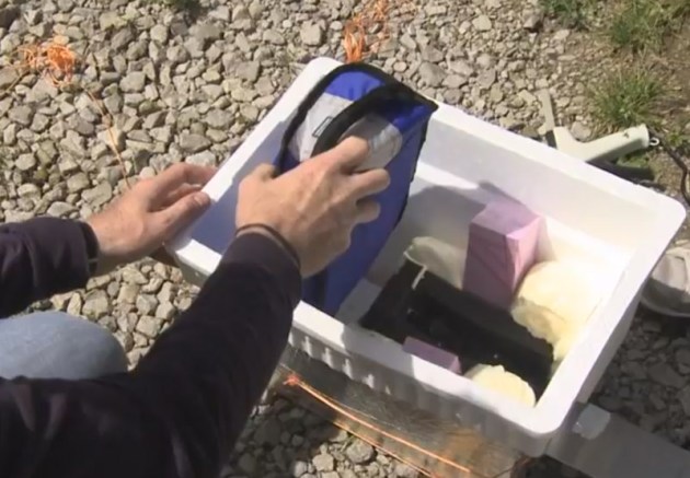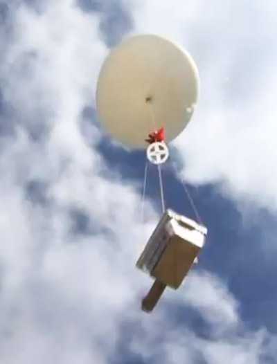The spacecraft used was a stryrofoam cooler dubbed “The Aluminum Fullcan” (ugh) that was fitted with a weather balloon, a sophisticated GPS device and some handwarmers from keeping the cargo from freezing and bursting.  Here’s the details of the flight from the YouTube video page: