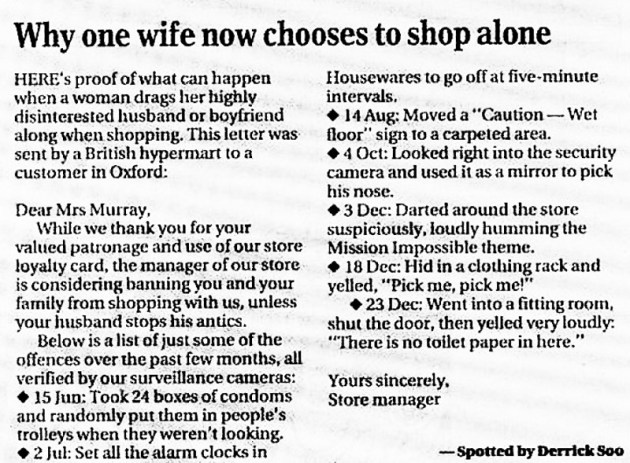 Maybe now his wife will let him join his friends at the pub while she shops. Fortunately for me, my wife hates to shop so its a non-starter. But I can see where some of these antics could prove useful.