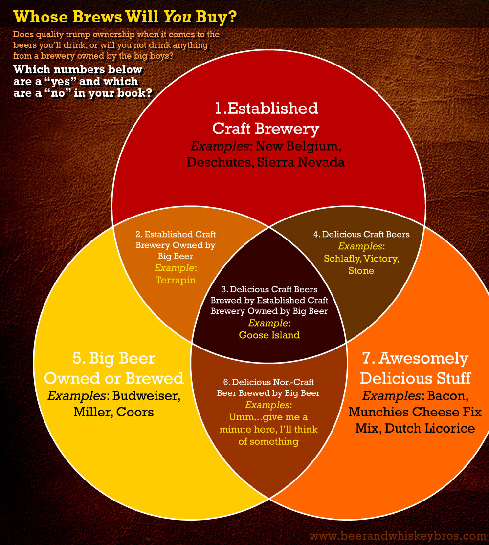 Cheers to sparking thoughtful discussion! I think the labels you’ve chosen, though, are problematic and only add to the confusion. The term ‘Craft Brewery’, though, has a pretty concrete definition (if you look past the ever-expanding barrel limits to keep Boston Beer Co. in the ranks) by the Brewers Association. According to that definition, a craft brewery can’t be owned by Big Beer-because ownership is actually part of the definition. ‘Delicious’ is definitely subjective, but shouldn’t it be a requisite of anything you consume? Even if you limit yourself by ownership, why would you drink anything outside of the ‘Delicious’ circle? Isn’t that the point? I don’t care how big or small a company is or anything else about it, why would I drink the beer if it’s not good?