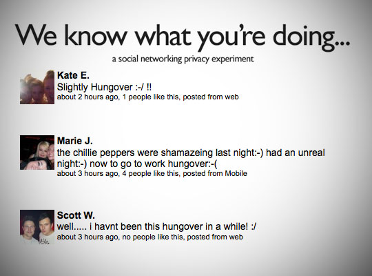 My buddy and fledgling pro-brewer Bill Bennett just shared this scary bit of business on Facebook. It’s a “social networking privacy experiment” called We Know What You’re Doing .com which collects unflattering public Facebook status updates and posts them to their site.