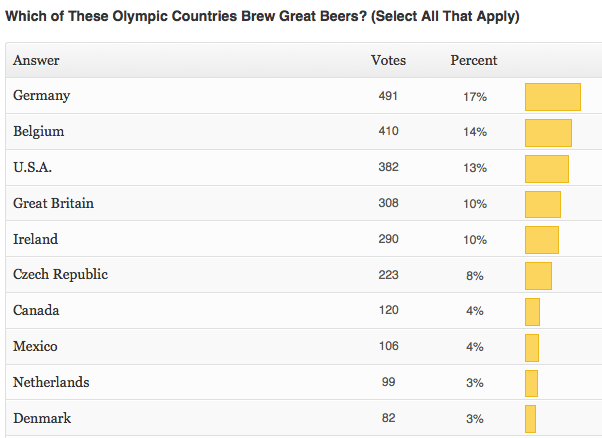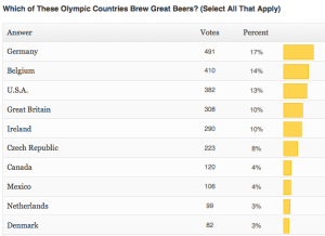 Last Thursday morning I posted an Olympic-themed poll here on B&WB, featuring a list of countries that brew beer and have athletes in the 2012 Games. The poll was simple – vote for all the countries that you think brew good beer. Over the course of the voting, the countries who got the most votes would rise to the top.