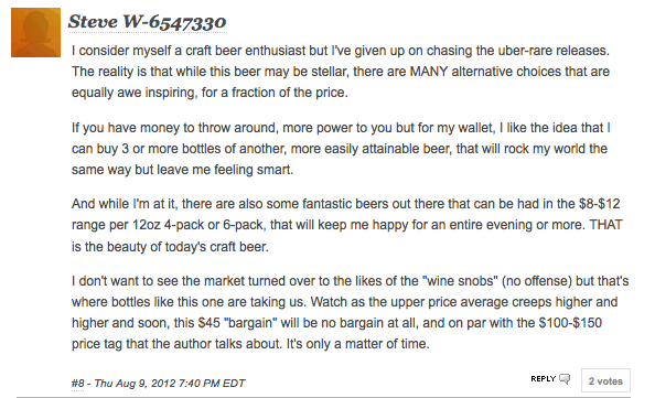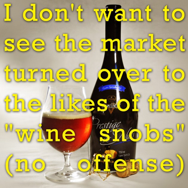 Second, as the craft market expands out of the niche of people it’s been in since 1980, there is going to be a much wider range of people — and budgets — who will be drinking it, people who will think nothing of $45 a bottle for ‘the very best.’ I’m a cheap wine drinker, I love a good wine for under $15, but there are a lot of $50 bottles being sold in that market, and calling everyone who buys a $50 bottle a snob is not just wrong, it’s unfair.