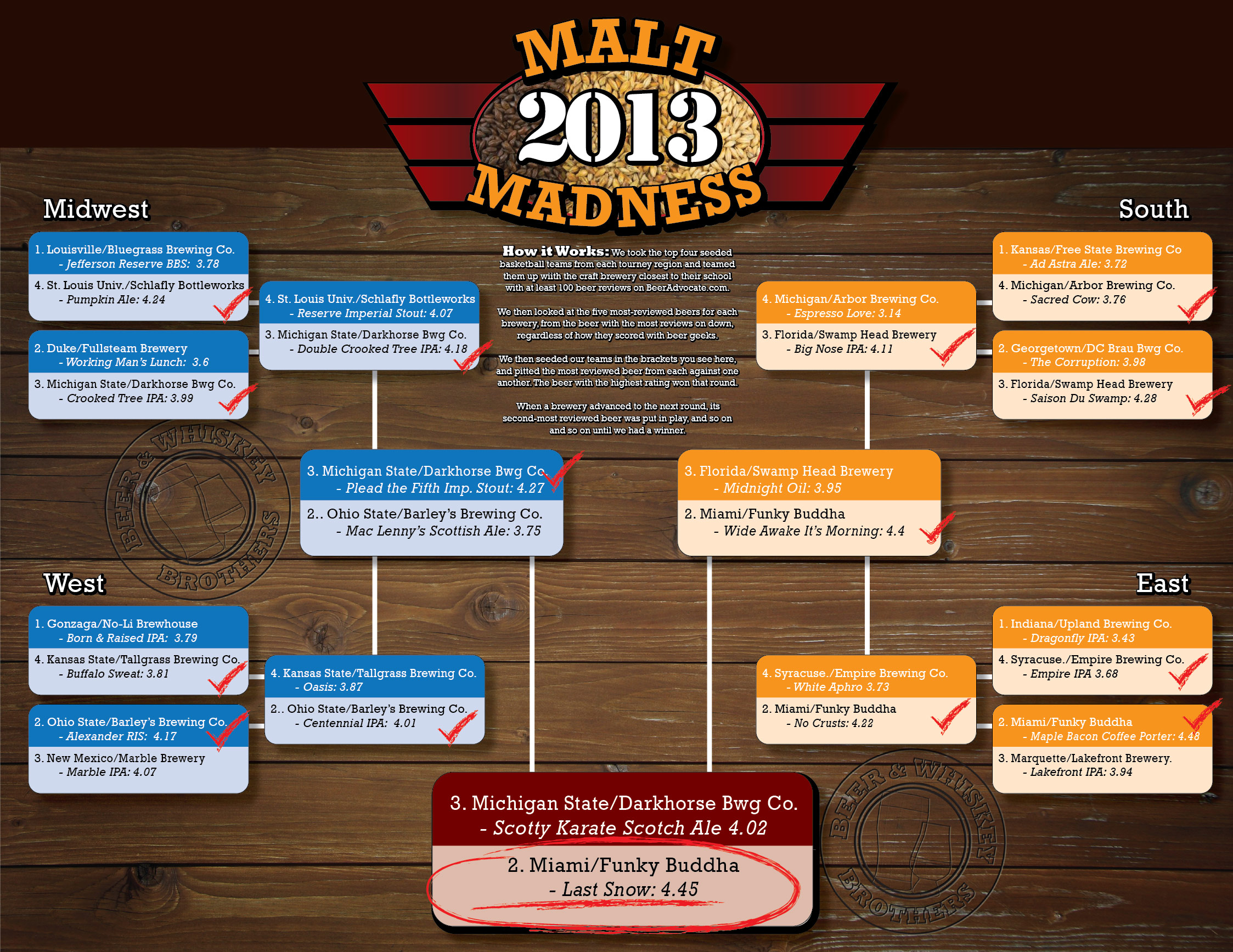 Check out the results below, and if you really want to nerd out, check out this PDF of Malt Madness 2013 Data we compiled for the contest.