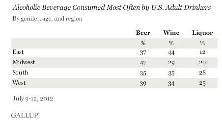 Gallop data also shows that folks from the Midwest lean more heavily towards preferring beer, while fancy East Coasters tend to drink more wine: