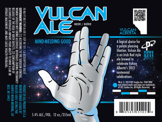 The first in a planned series of Star Trek inspired brews, Vulcan Ale is a 5.4% ABV Irish Red Ale brewed under contract by Montana’s Harvest Moon Brewing Company for Canadian distributor Delancey Direct. Early indications are that it’s a decent beer, but what “Irish” and “Vulcan” have in common is anyone’s guess – do the Vulcans even have drinking songs?